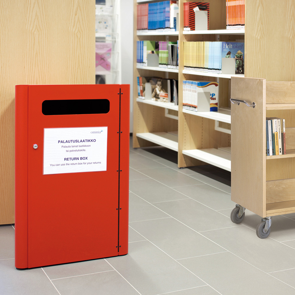 Lockable cabinet equipped with an anti-theft fitting at the bottom. Supplied with basket on wheels and icon signs for books and CDs/DVDs.
