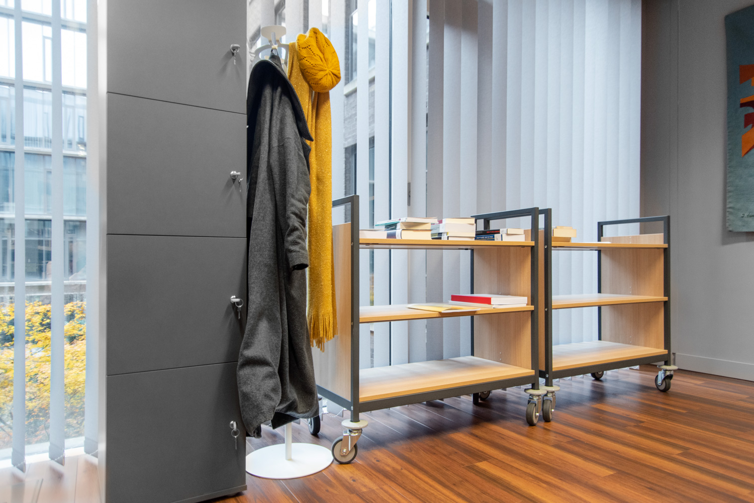 The robust shape and versatile design of this book trolley make it adaptable to the specific requirements of the library or institution at hand. The numerous functions such as fastened or removable middle separators; slanted or straight shelves and wooden or metal shelves, culminate in a multi-functional book trolley that not only meets the everyday prerequisites of a functioning library but also the special demands.