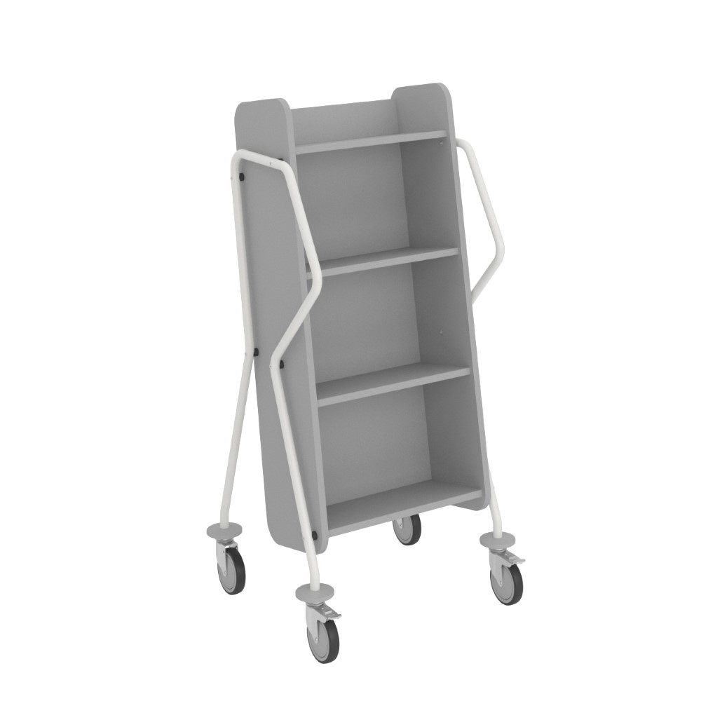 Ergonomic, user-friendly, single-sided book trolley with 4 shelves. Generous amount of clearance between shelves to accommodate larger books.