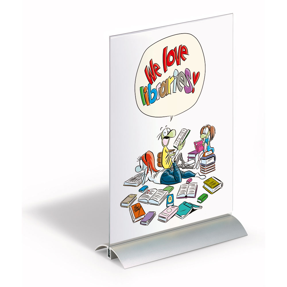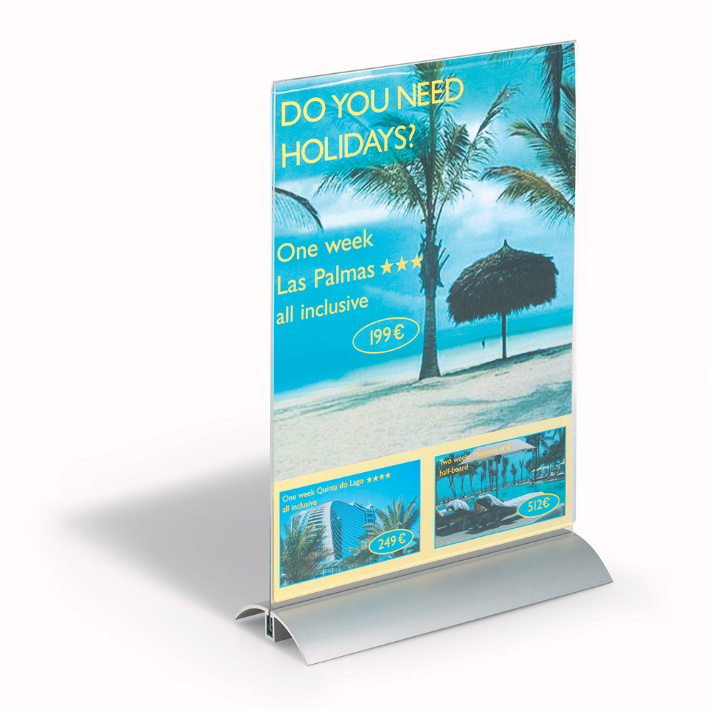 Exclusive double-sided sign for tables, countertops, shelves, window displays, etc.
