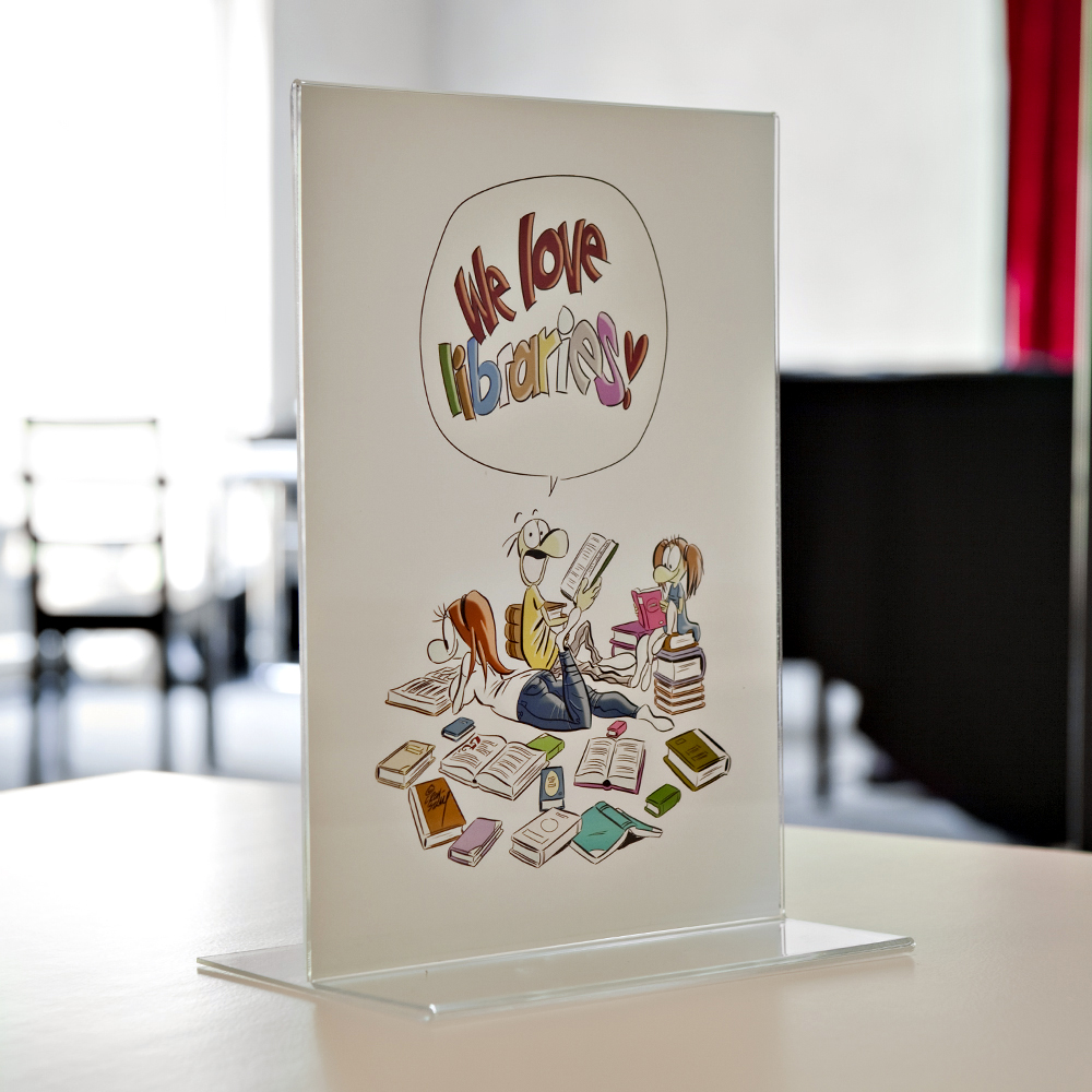 Practical double-sided stands for signs and information for tables, countertops, shelves, window displays, etc..
