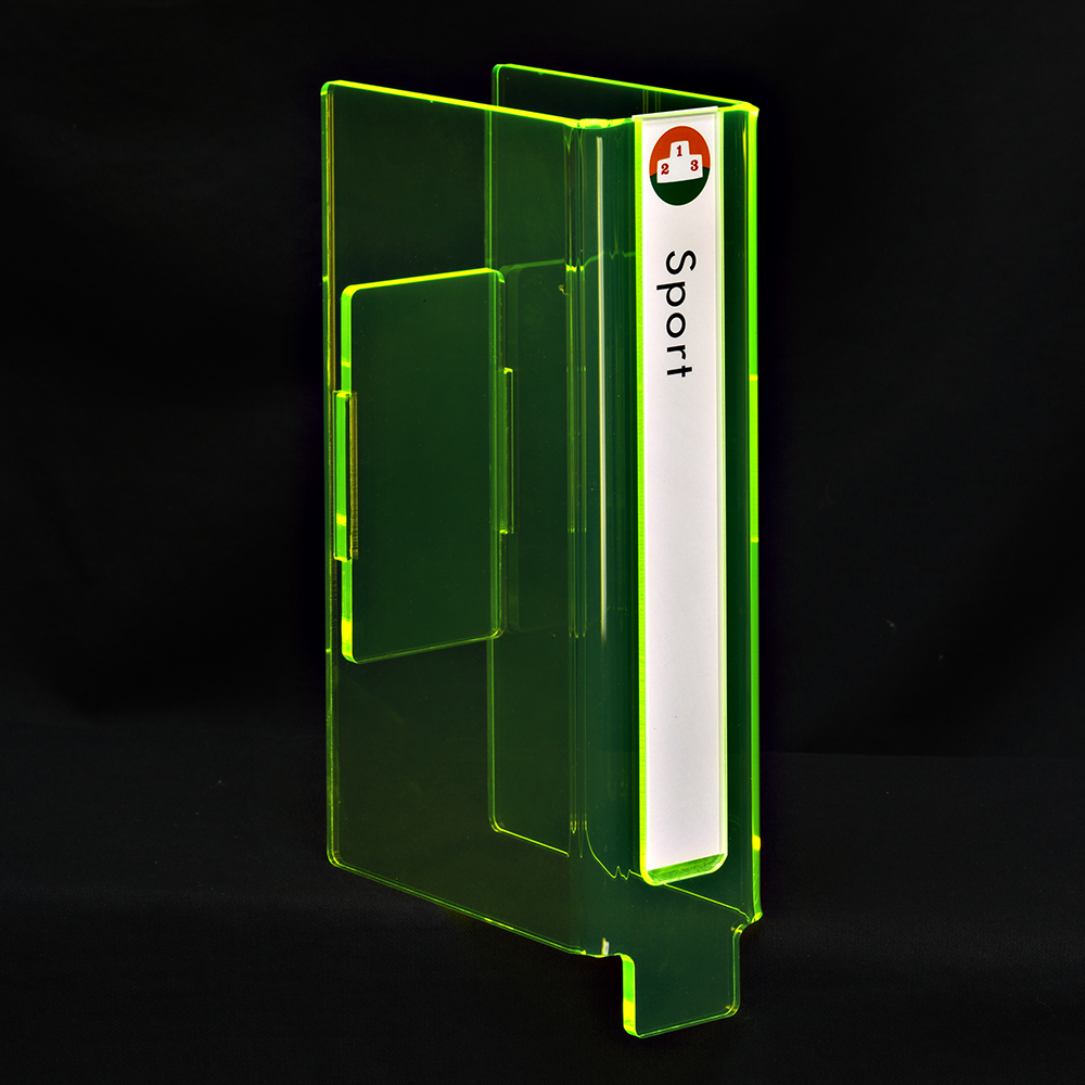 On-shelf guider manufactured in a high quality glass look or fluorescent neon acrylic.