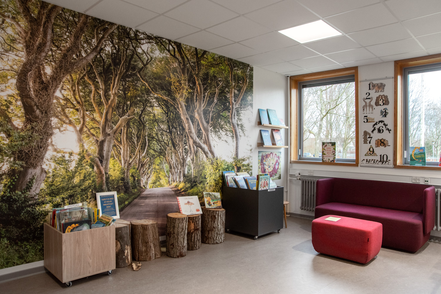 Graphics depicting trees and forest landscapes are popular themes for us and feature heavily in children’s graphics. These are further supported by the use of e.g. wooden browsers, tree stumps seating and green displays and book supports. By devoting an entire wall or the floor to nature inspired graphics, the place can be completely transformed into the mythical natural world, with all the magical creatures that inhabit therein.