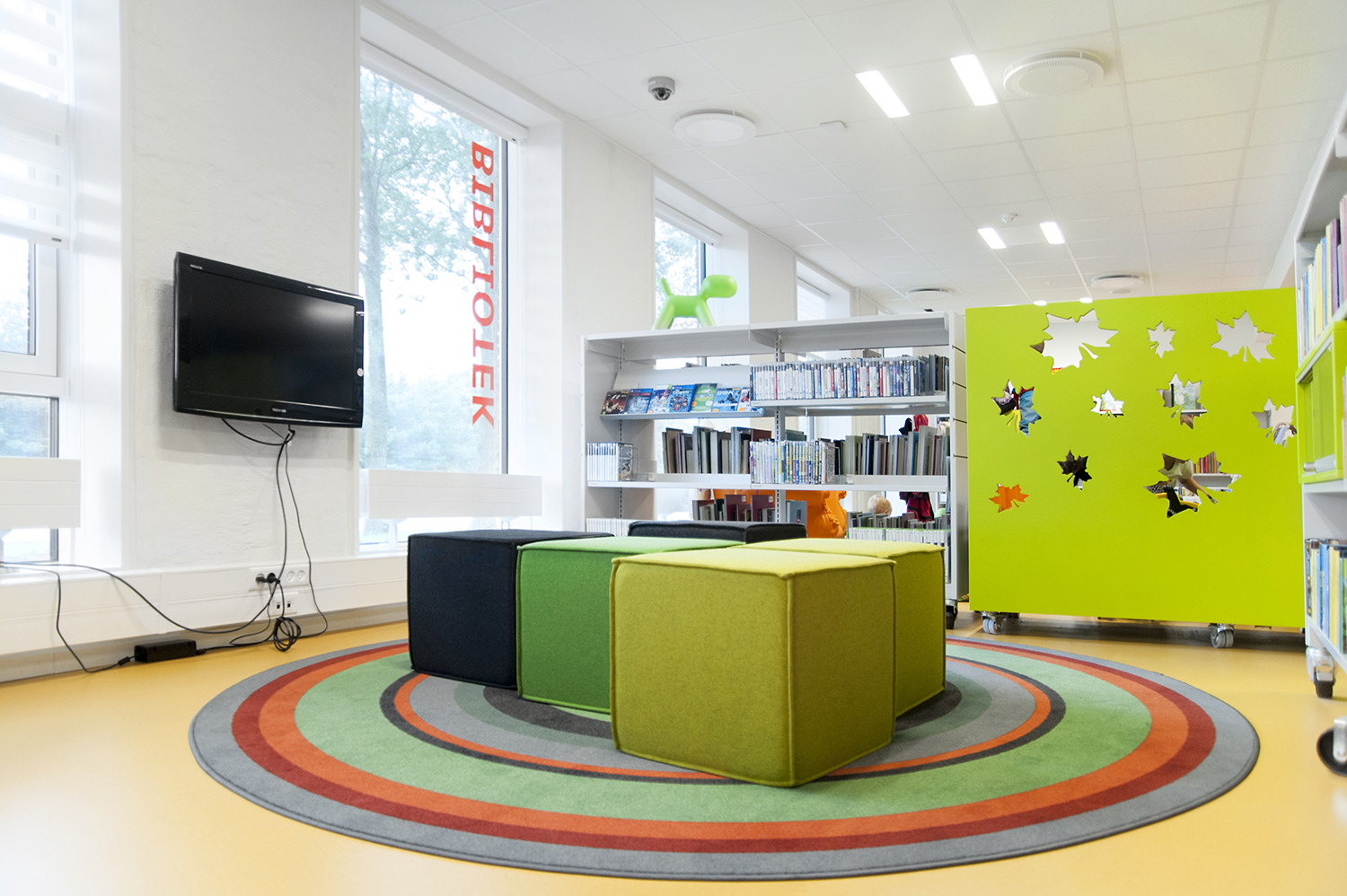 Carpets in curvy, organic shapes are a good contrast to the rigid, square-lined shelving