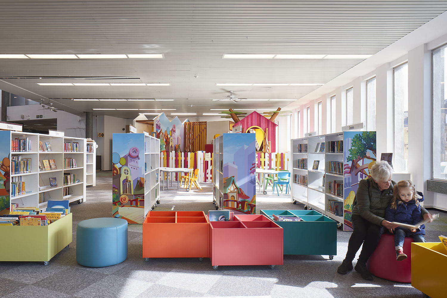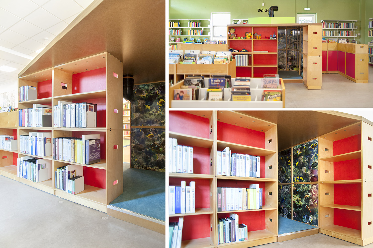 The existing, robust solid plywood shelving was combined with new materials and utilised to define spaces including play dens and a submarine! Rugs were added to soften surfaces and foil graphics to replicate aquariums and forest scenes.