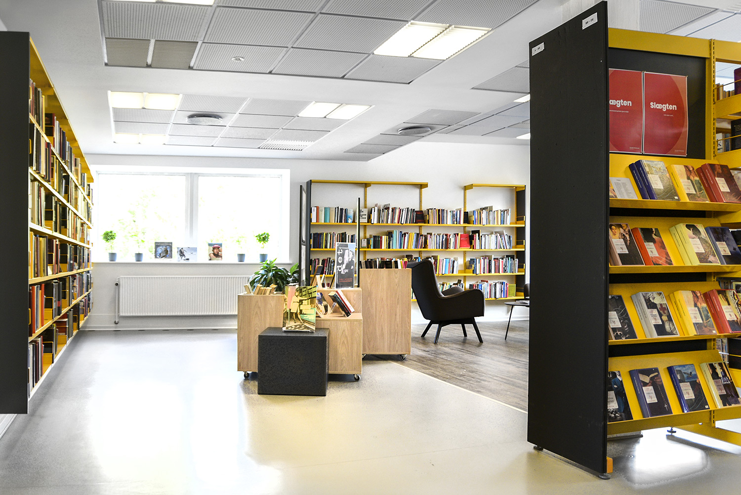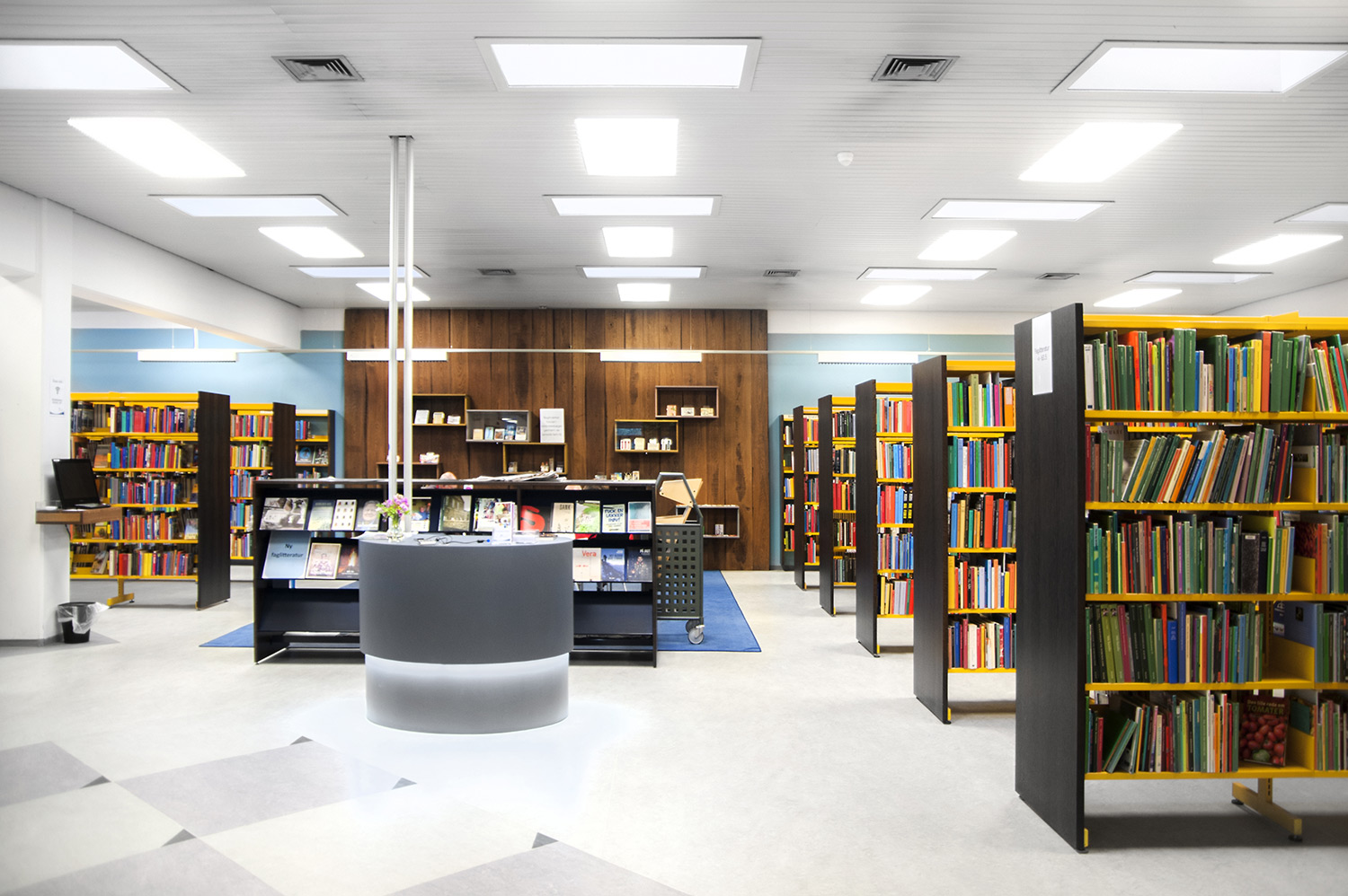 The re-design focus of Horsens Library was to retain and upcycle the “striking” yellow shelving! By wrapping the shelving with anthracite grey panels, we created a modern contrast between old and new.