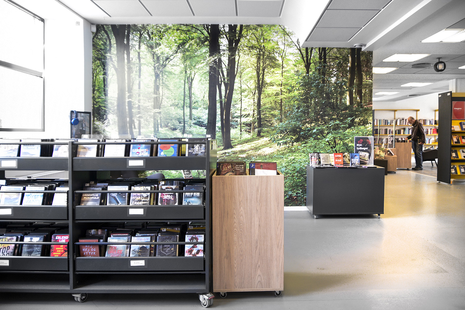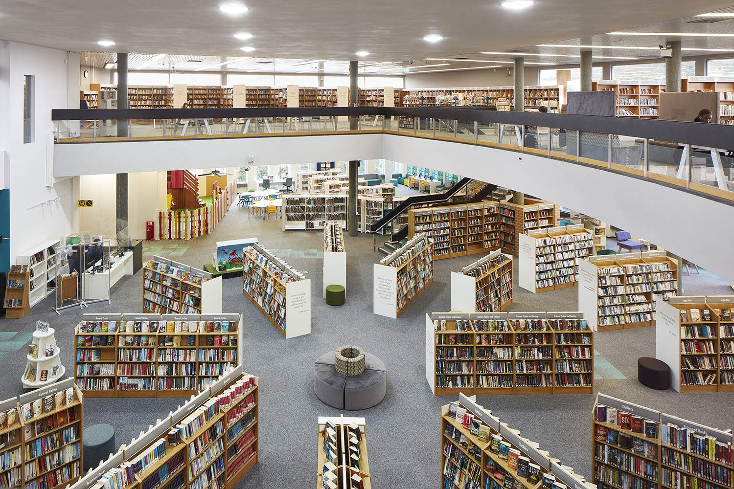 We introduced new anthracite and oak mobile, modular display podiums, timber flooring, and foil graphics to the walls showing forest scenes to the adult areas, and images of cabins and wildlife to the children’s area, all with a view of introducing a biophilic element to the library.