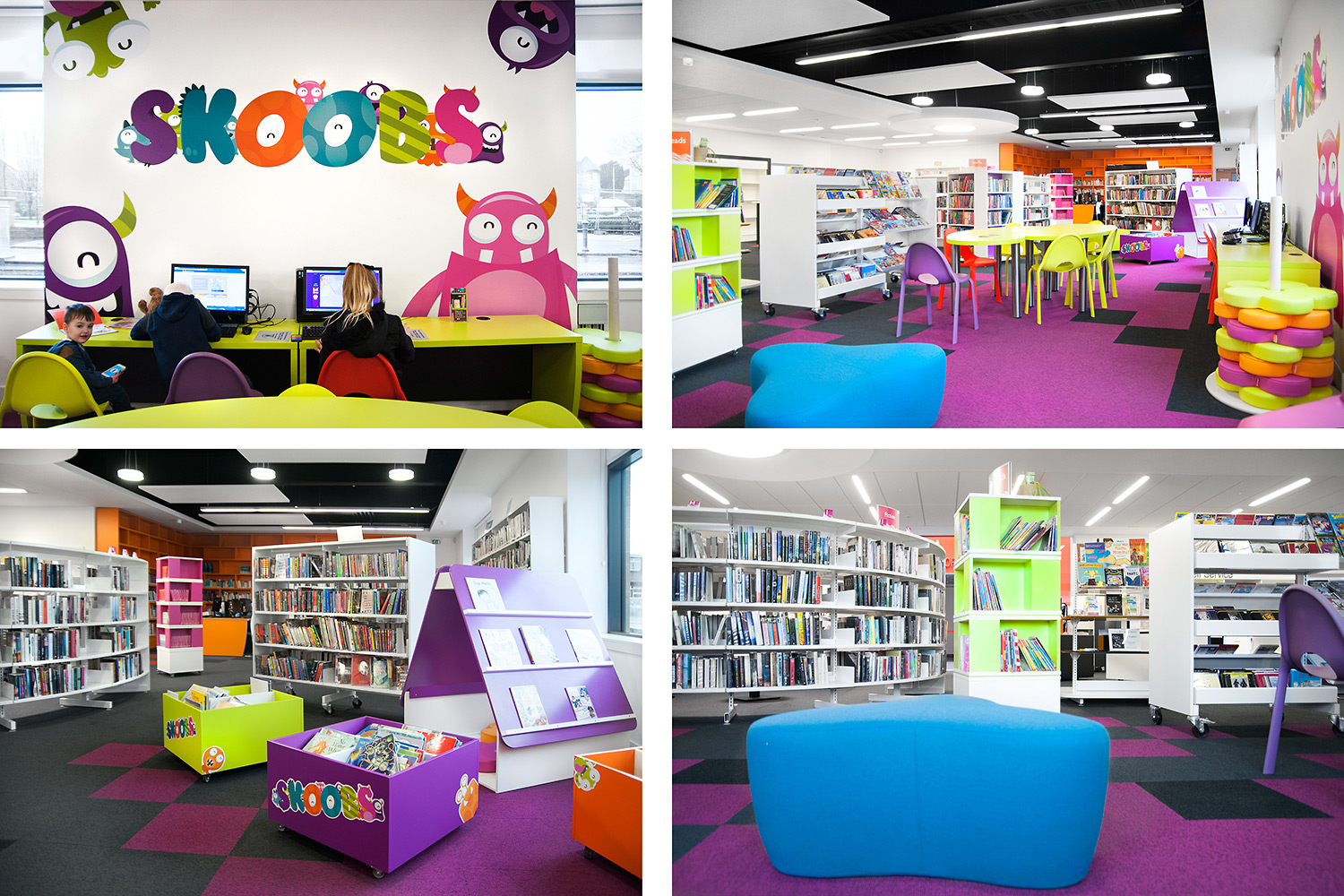 Right: The Show It display units, paired with neon book towers provide optimal display flexibility and inject even more vibrant colour to the library space.