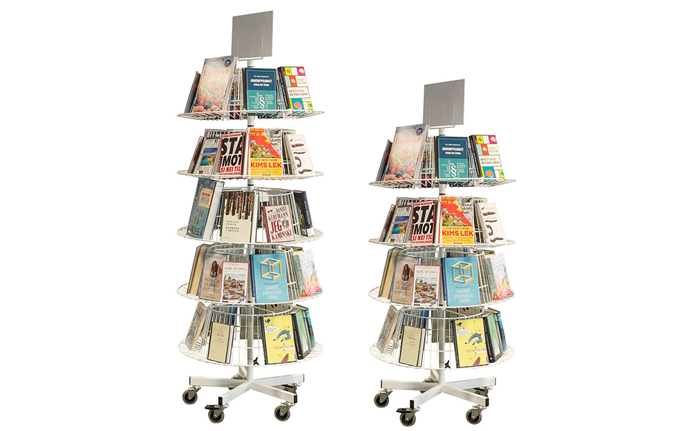 The classic book carousel is available in a midi version (4 shelves) and a maxi version (5 shelves). Each shelf can be turned separately.