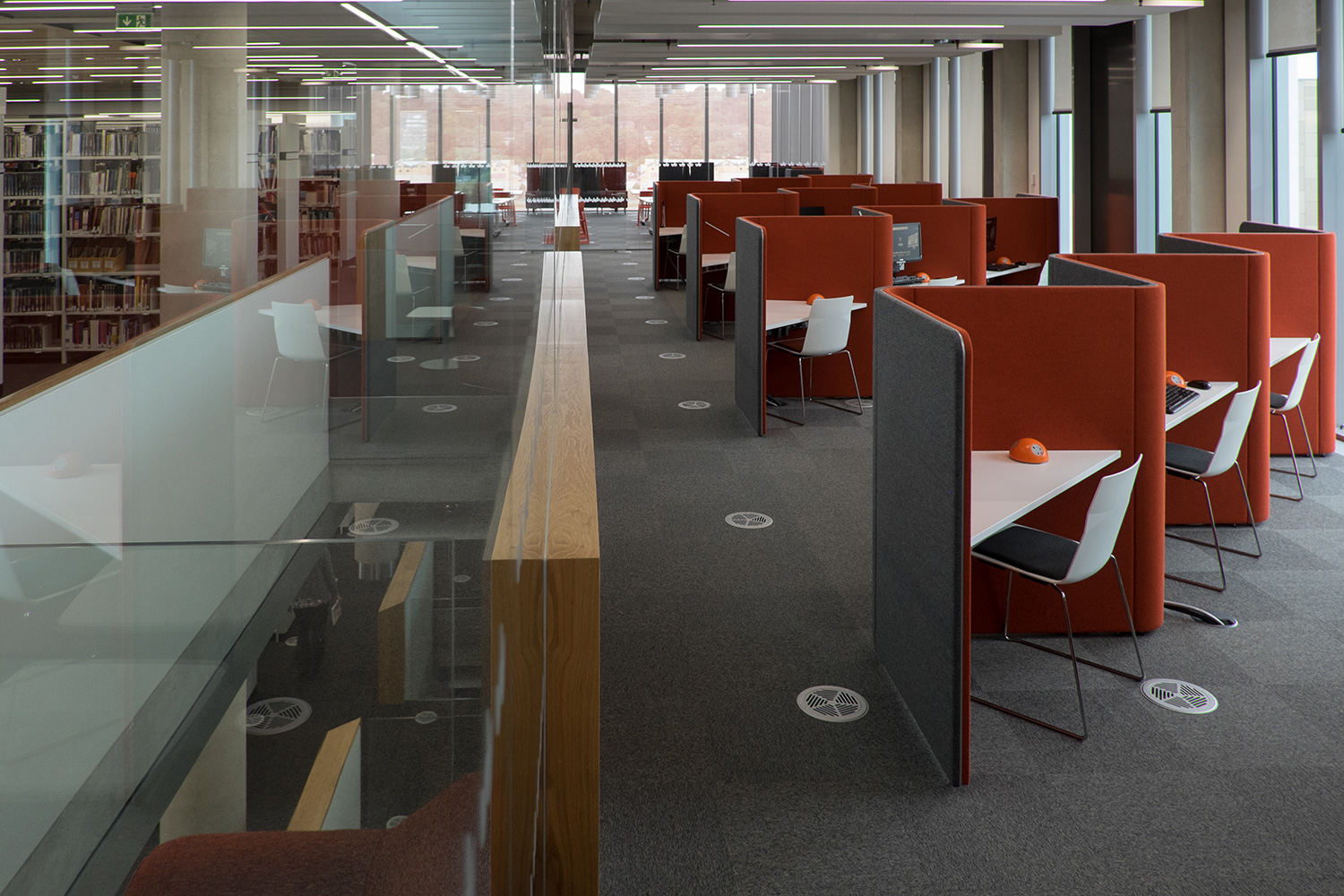 Booths can be seen in various colour ranges through the library. Arm chairs with high backs, reduces sound from surrounding areas and are integrated with work surfaces and pluto power stations have been added that allow students to plug-in laptops and also have twin USB ports. Five person circular table/desk capable of accommodating computer screens with power-up and down option to provide screen-less, flat table surface when required, keyboard and mouse housing and integral cable tray is also included. Working with the University’s existing shelving system, the study booths give the space a modern feel and injects an array of colours to the entire space.