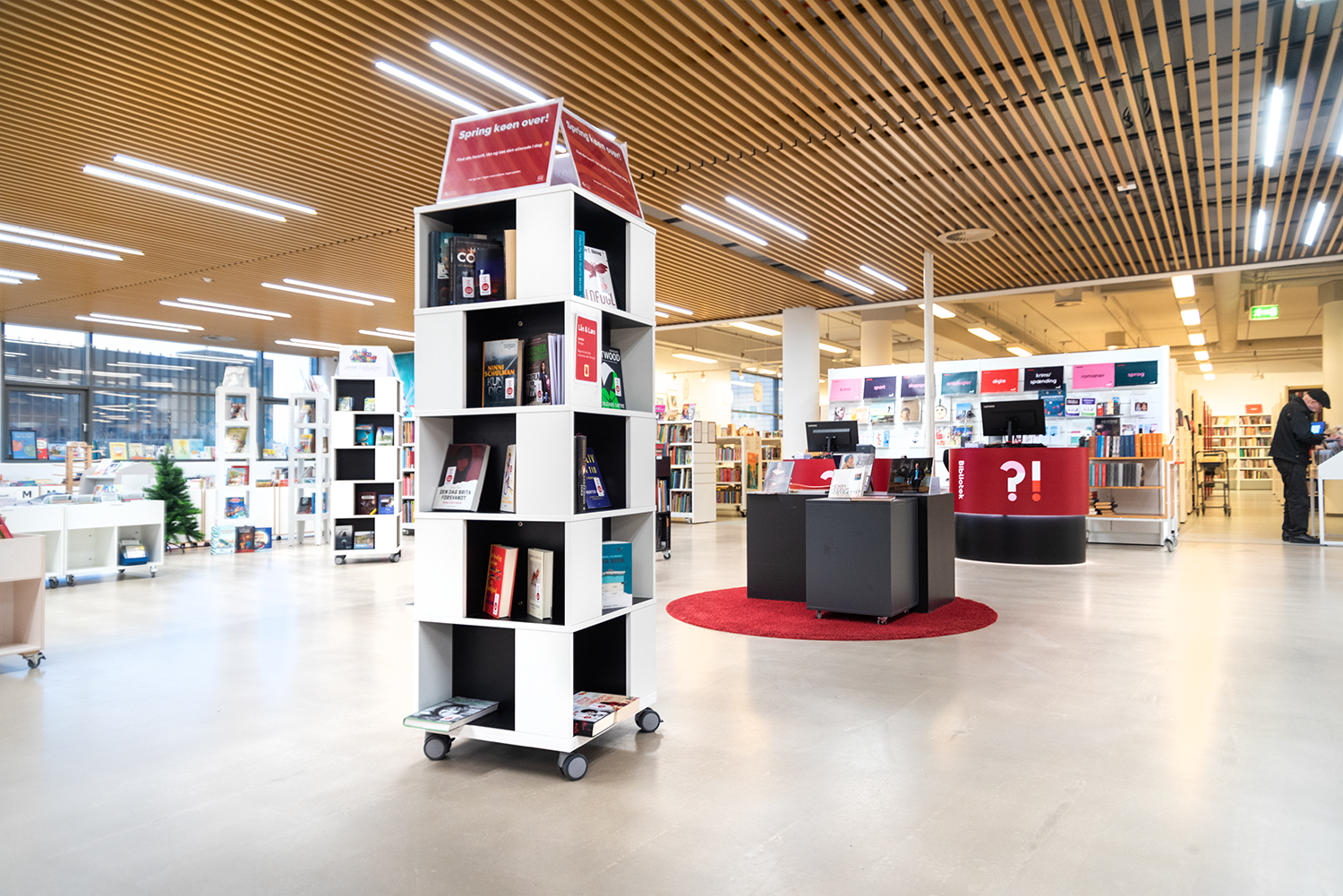 Freestanding mobile tower combining display with storage. Good capacity with 4 compartments per level.