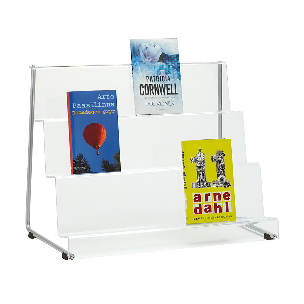 Freestanding, single-sided, 3-tier stand for forward-facing display of books.