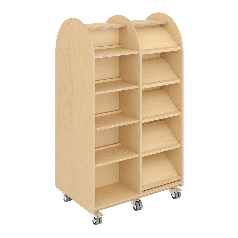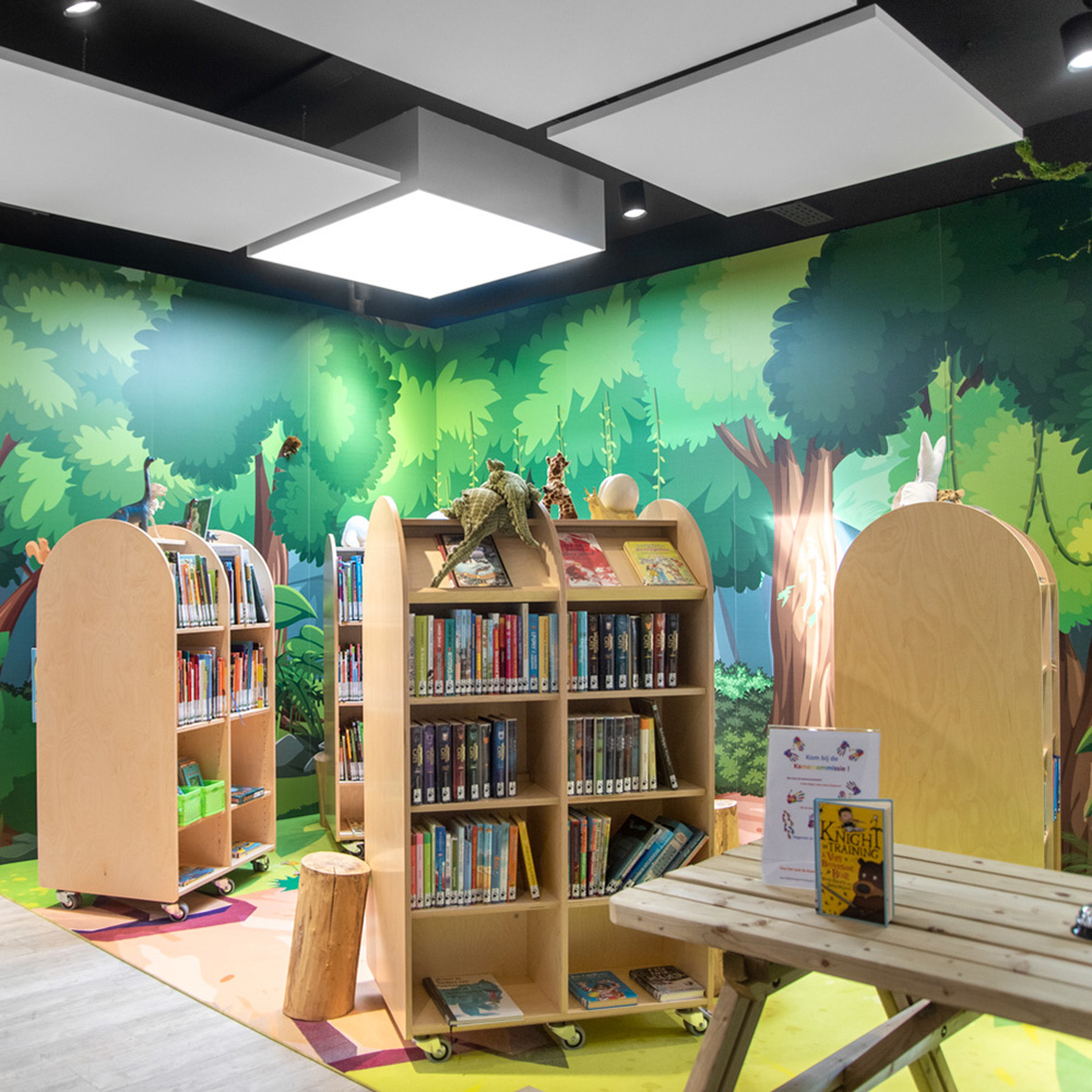 Build inspiring “urban spaces” with buildings of different heights and depths. Invite visitors on a walk around town along the building façades with inviting “display windows” full of books, magazines and much more! Ideal as focal points for all visitors.