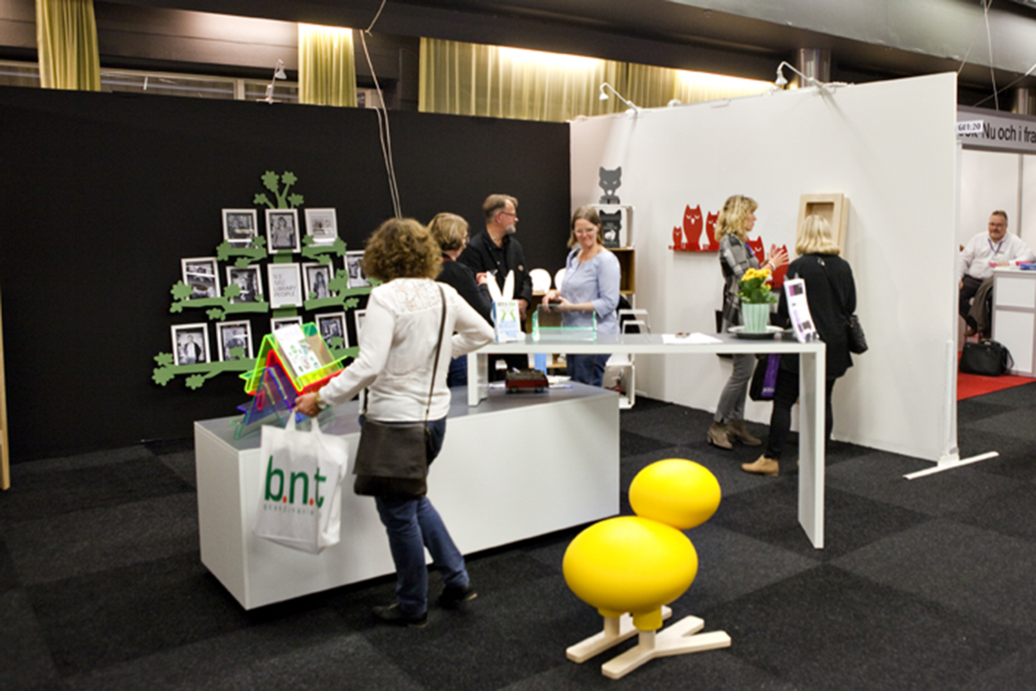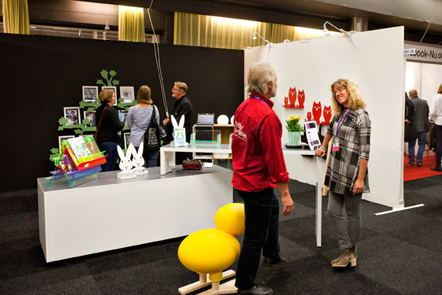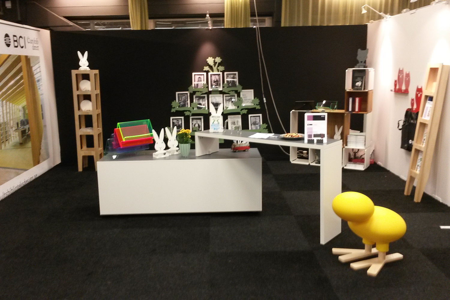 ShowIt display elements with box and bar in white with Virrvarr laminate on top served as excellent meeting and display area while Happy Bird attracted many visitors to the fair to both smile and testing to sit on.
