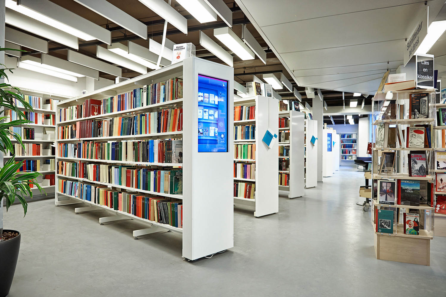 The result is a state of the art library with technology integrated into the shelving, like touch-screens in the end panels and LED lights integrated into display shelving.