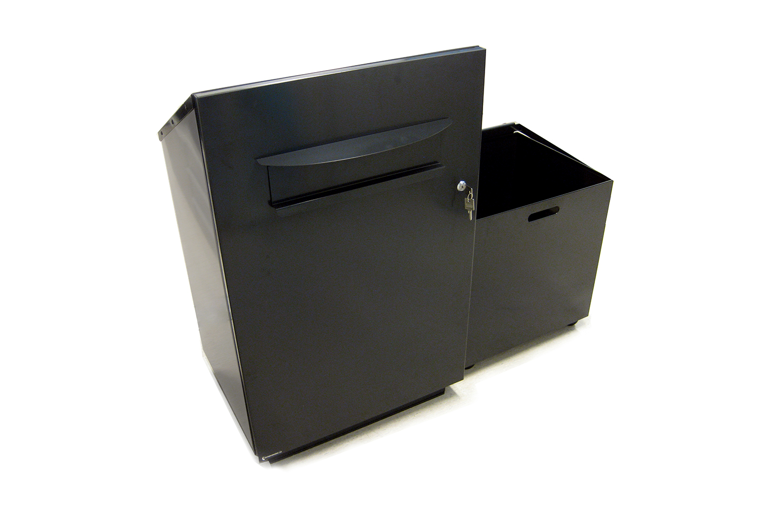 This weather robust cabinet can be placed outside and is very suitable for libraries with limited opening hours. The media collection box inside the return cabinet is with castors and handle for easy transport of books into the library.