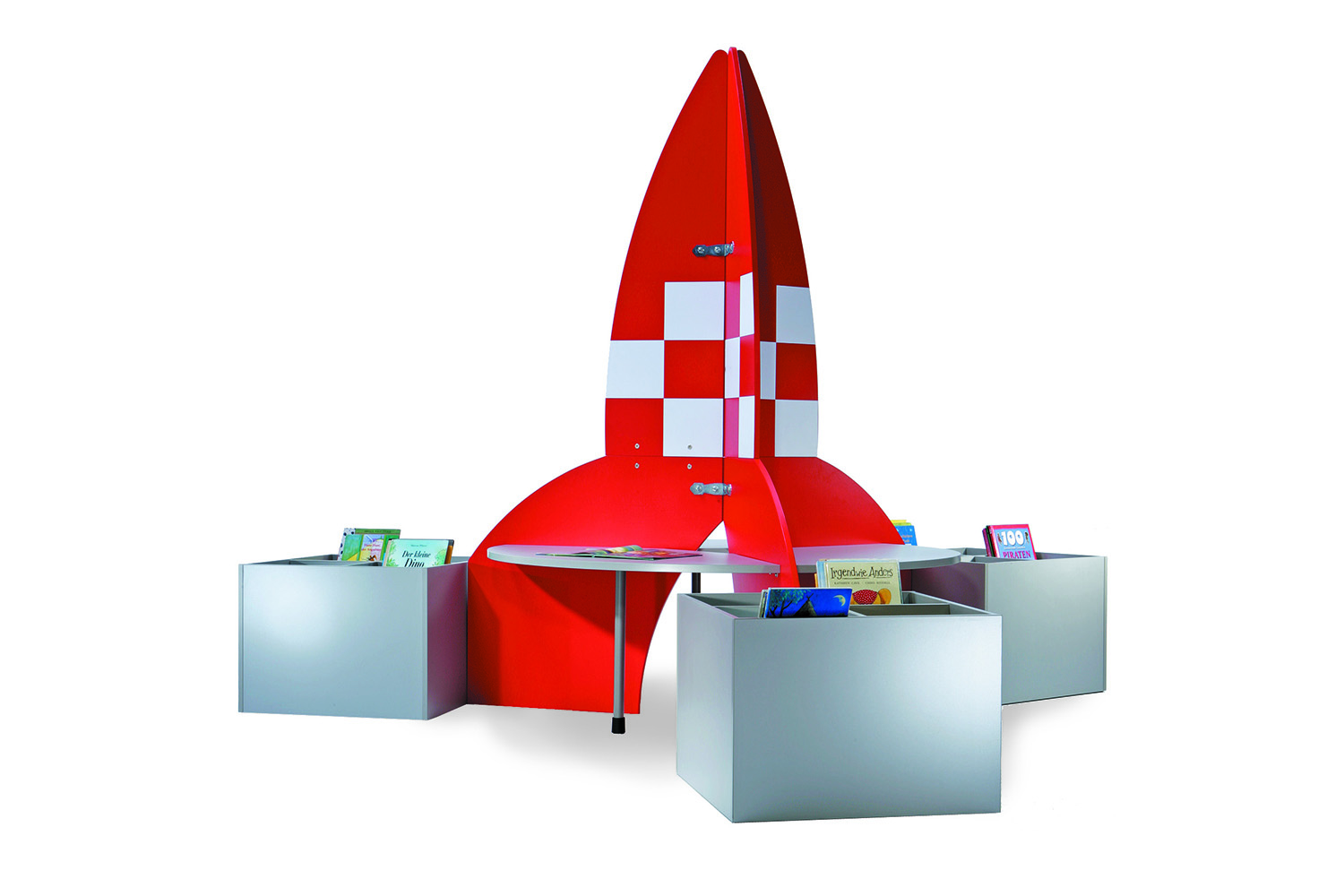 With three circular workstations, the Reading Rocket creates a perfect reading and research space for little make-believe astronauts. The workstations are separated from one another by the rocket body and each is a sufficient size for two people working at the same time.