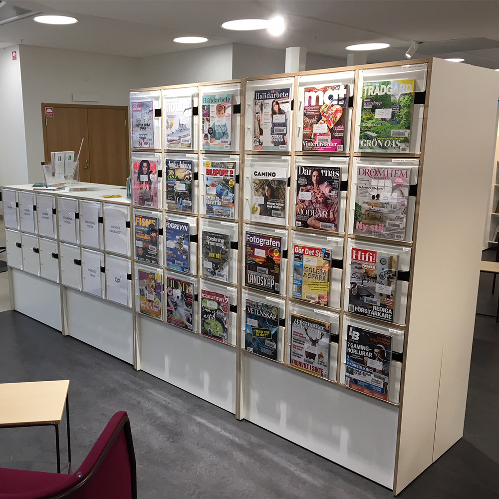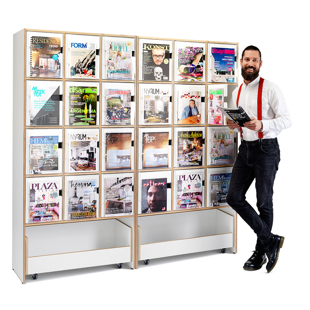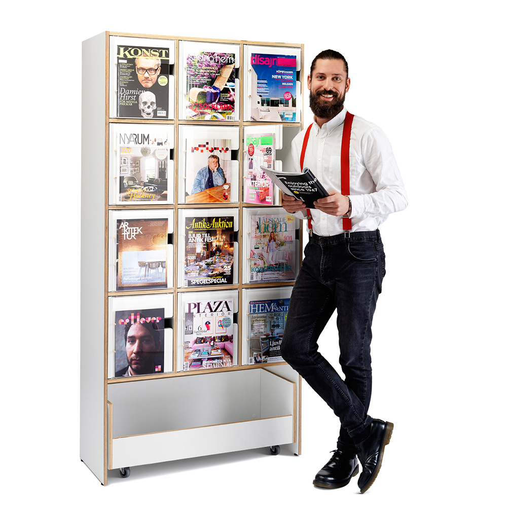 Slim exposure and storage furniture for magazines and other periodical publications. Cabinet doors with acrylic door fronts; generous display depth.